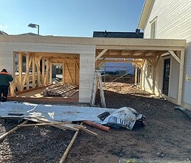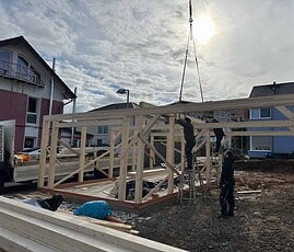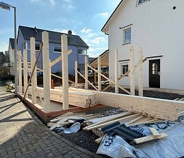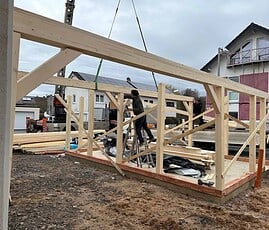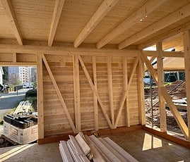 Für Pfosten, Kopfbänder und Unterzüge (auf Wunsch auch Sparren) wird ausschließlich qualitativ hochwertiges, getrocknetesLeimholz (BSH bzw. Duo) aus Fichte/Tanne verwendet.