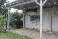 Sparrendach 10/16 cm auf 2 Unterzügen 14/20 cm. Gefaste Sichtschalung aus 19 mm dicken Nut- und Federbrettern und umlaufender Blende. Grundeindeckung V13 beschiefert. Befestigungsmaterial in verzinkter Ausführung (ohne Pfostenschuhe).