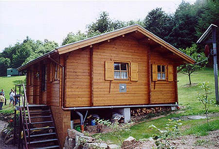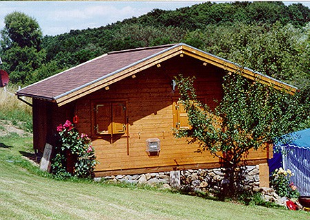 | Dach : | Sichtschalung von der Traufe bis zum First bestehend aus 19 mm dicken Nut- und Federbrettern. An den Giebelseiten ein doppeltes Schirmbrett, an der Traufe gefalzte Traufblenden. Die Dachkonstruktion ist statisch für eine Ziegeleindeckung ausgelegt. |