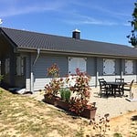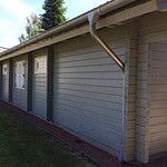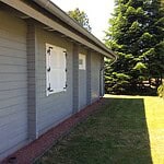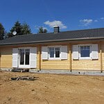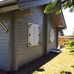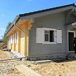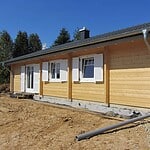 | Dach : | Sichtschalung von der Traufe bis zum First bestehend aus 19 mm dicken Nut- und Federbrettern. An den Giebelseiten ein doppeltes Schirmbrett, an der Traufe gefalzte Traufblenden. Die Dachkonstruktion ist statisch für eine Ziegeleindeckung ausgelegt. |