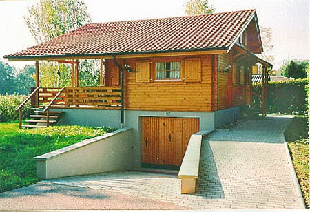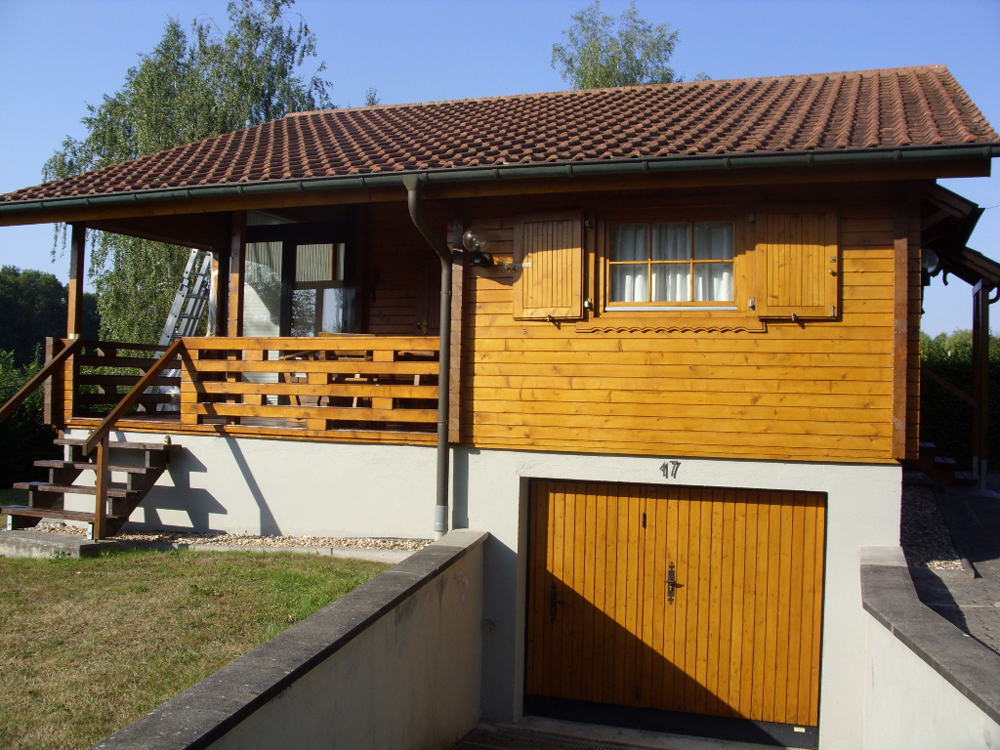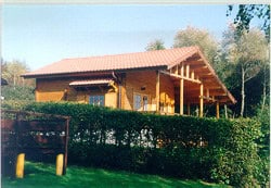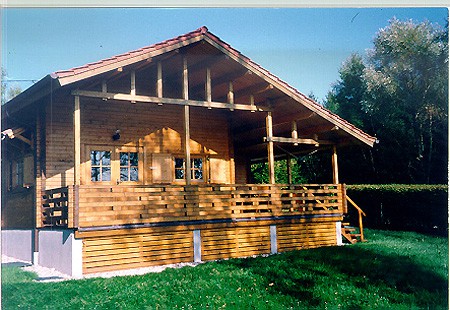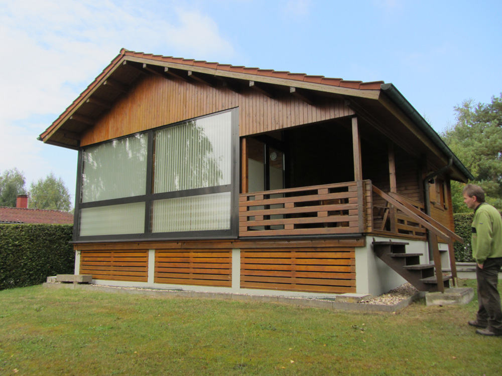 | Dach : | Sichtschalung von der Traufe bis zum First bestehend aus 19 mm dicken Nut- und Federbrettern. An den Giebelseiten ein doppeltes Schirmbrett, an der Traufe gefalzte Traufblenden. Die Dachkonstruktion ist statisch für eine Ziegeleindeckung ausgelegt. |