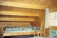 | Fussboden : | 19 mm oder 21 mm dicke Nut- und Feder- Fichtendielen und Bodenleisten auf imprägniertem Fußbodenlager 6/8 cm. |