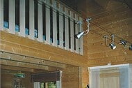 | Dach : | Sichtschalung von der Traufe bis zum First bestehend aus 19 mm dicken Nut- und Federbrettern. An den Giebelseiten ein doppeltes Schirmbrett, an der Traufe gefalzte Traufblenden. Die Dachkonstruktion ist statisch für eine Ziegeleindeckung ausgelegt. |