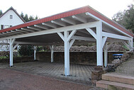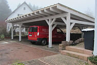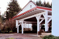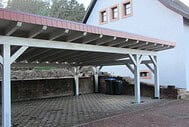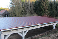 8 Pfosten 18/18 cm mit Kopfbändern, Sparren 10/20 cm allseitig gehobelt und gefast, Sparrenköpfe geschrägt, 2 Unterzüge 18/24 cm, Material BSH Waagerechte Querverbindung zwischen vorderem und hinterem Unterzug mit Kopfbändern und Aussteifung. Dachschalung 19 mm N+F. V 13 beschiefert als Ersteindeckung. (Abbildung zeigt Stahltrapezblech und Fassadenplatten als Zubehör) Incl. Befestigungsmaterial in verzinkter Ausführung (ohne Pfostenschuhe)