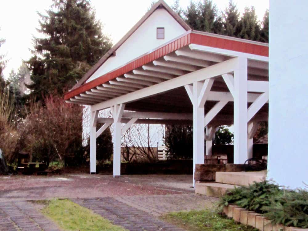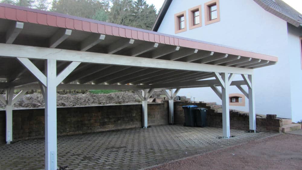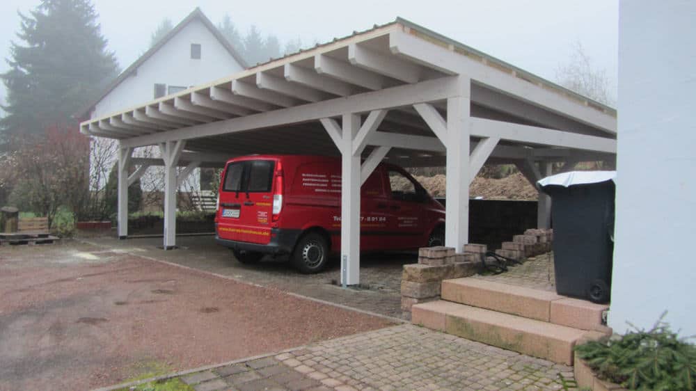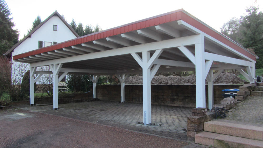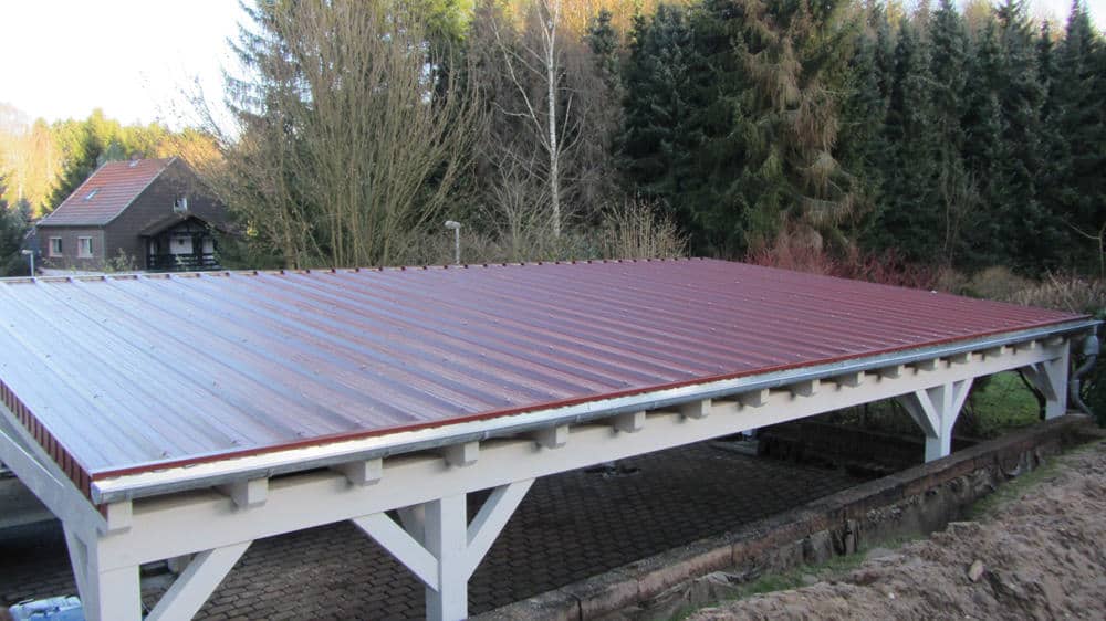 8 Pfosten 18/18 cm mit Kopfbändern, Sparren 10/20 cm allseitig gehobelt und gefast, Sparrenköpfe geschrägt, 2 Unterzüge 18/24 cm, Material BSH Waagerechte Querverbindung zwischen vorderem und hinterem Unterzug mit Kopfbändern und Aussteifung. Dachschalung 19 mm N+F. V 13 beschiefert als Ersteindeckung. (Abbildung zeigt Stahltrapezblech und Fassadenplatten als Zubehör) Incl. Befestigungsmaterial in verzinkter Ausführung (ohne Pfostenschuhe)