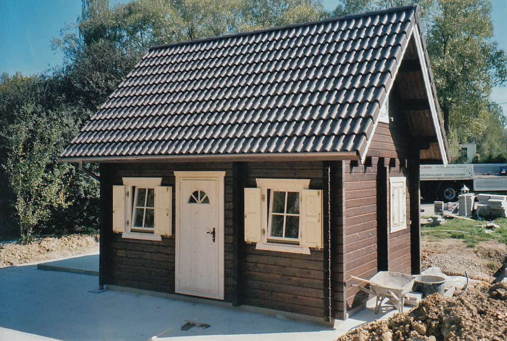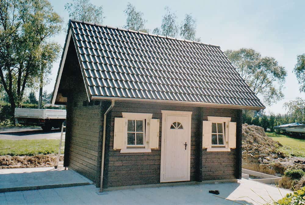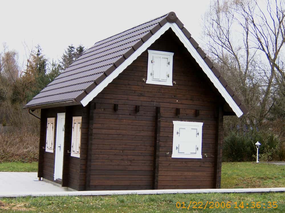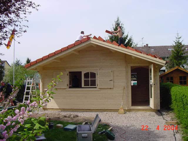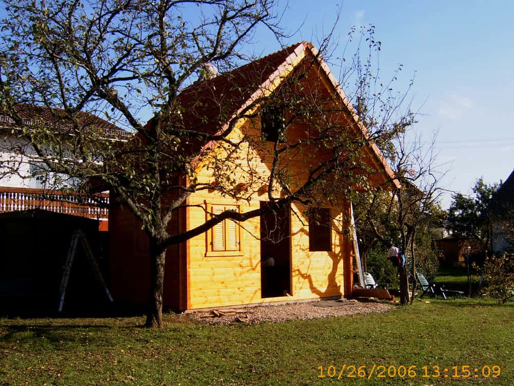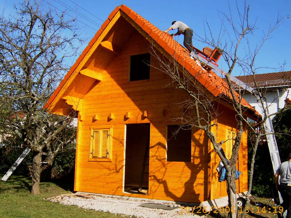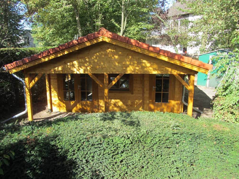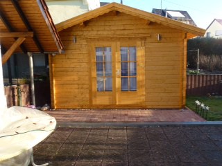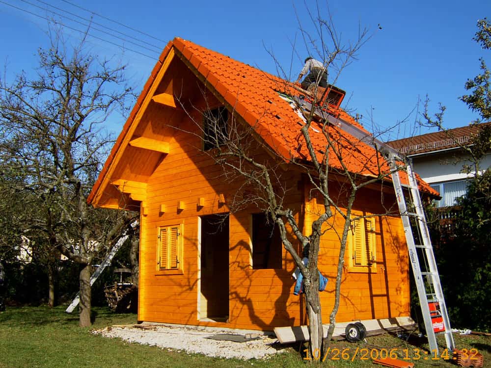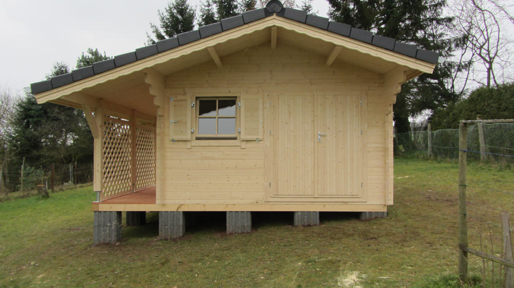 | Dach : | Sichtschalung von der Traufe bis zum First bestehend aus 19 mm dicken Nut- und Federbrettern. An den Giebelseiten ein doppeltes Schirmbrett, an der Traufe gefalzte Traufblenden. Die Dachkonstruktion ist statisch für eine Ziegeleindeckung ausgelegt. |