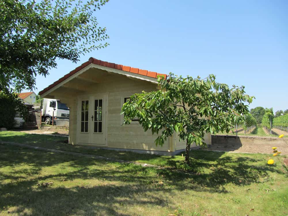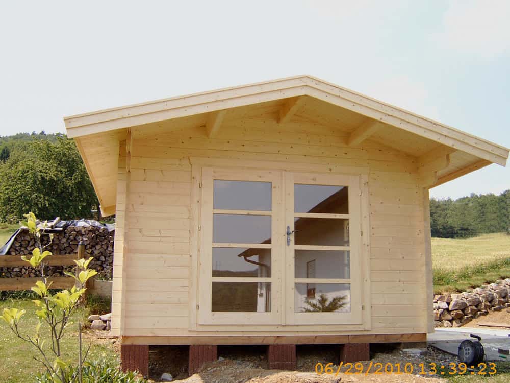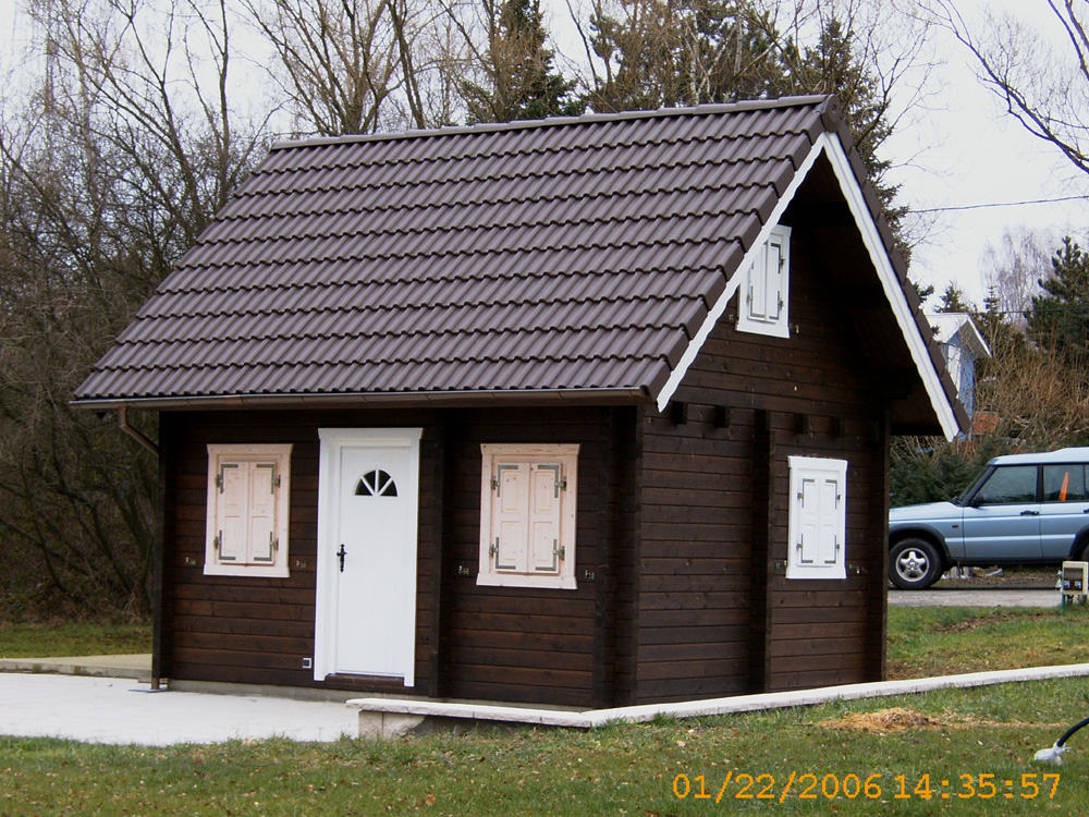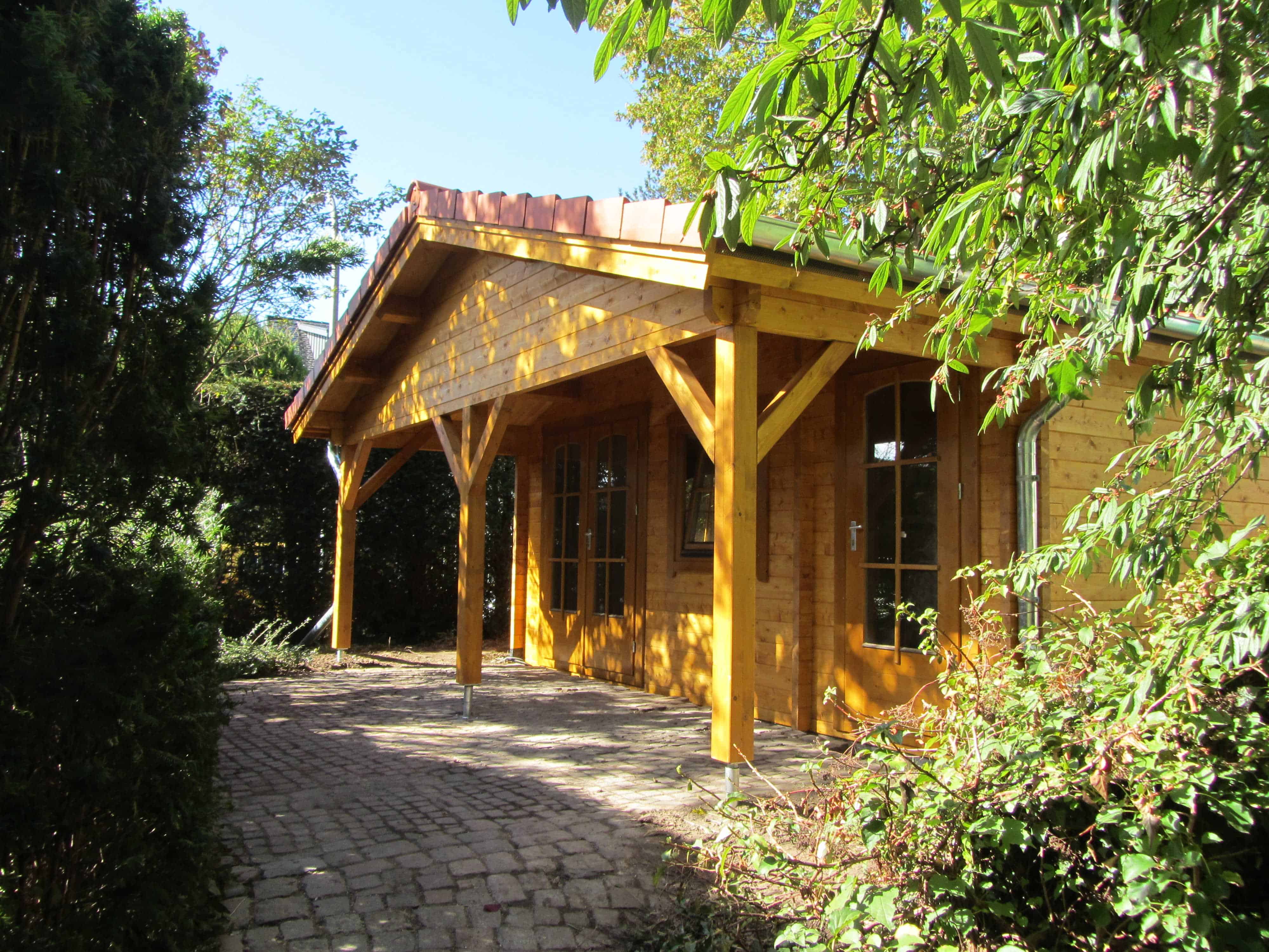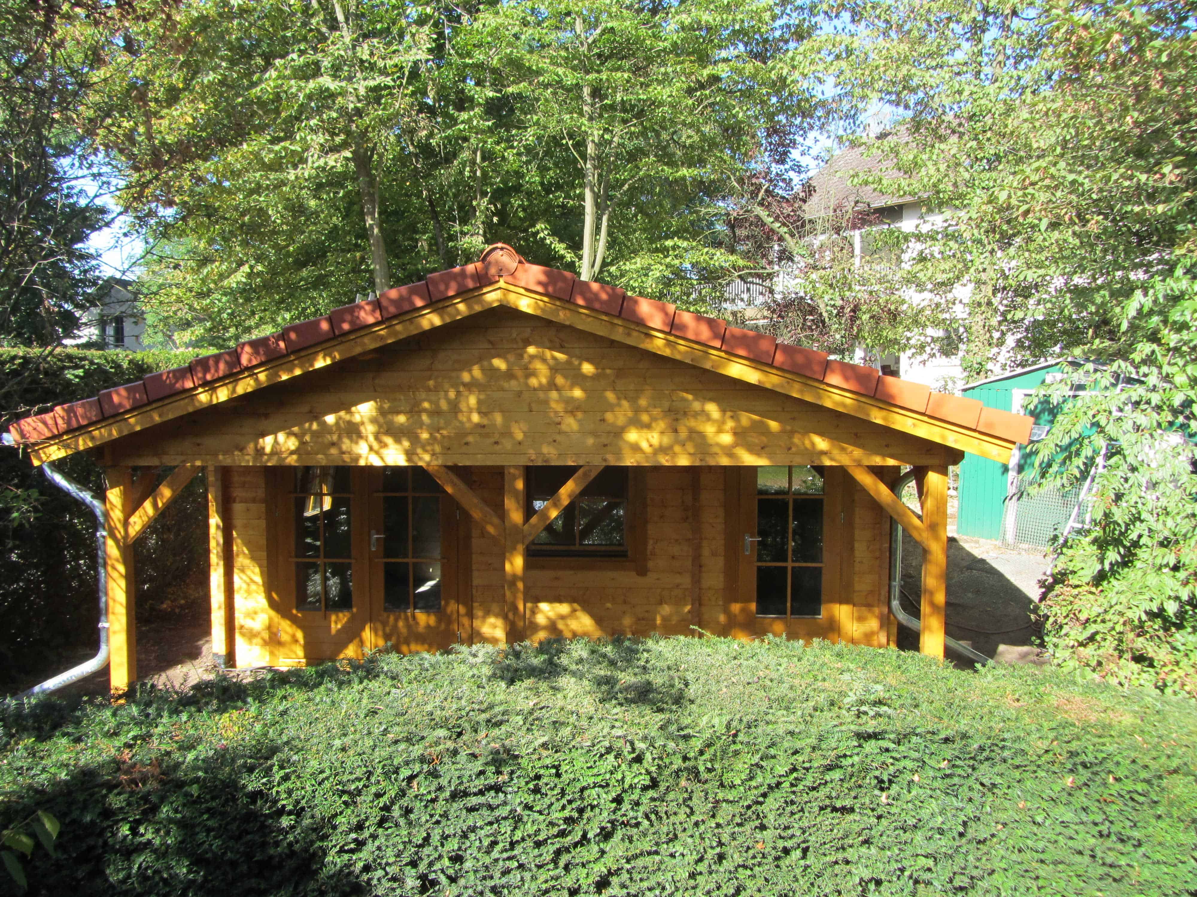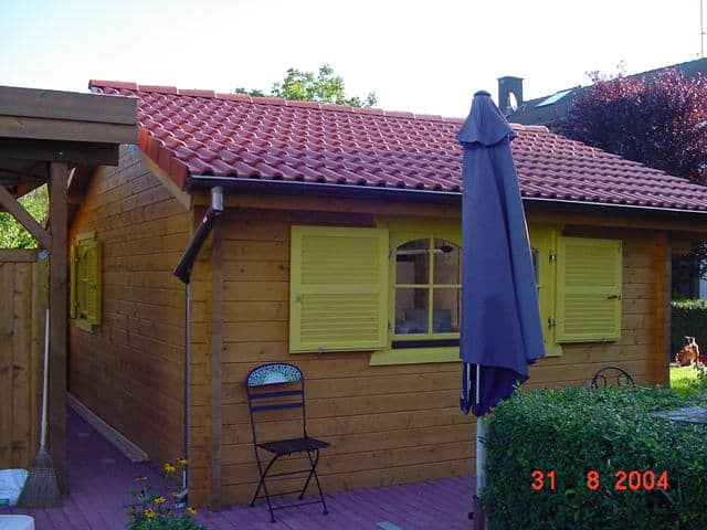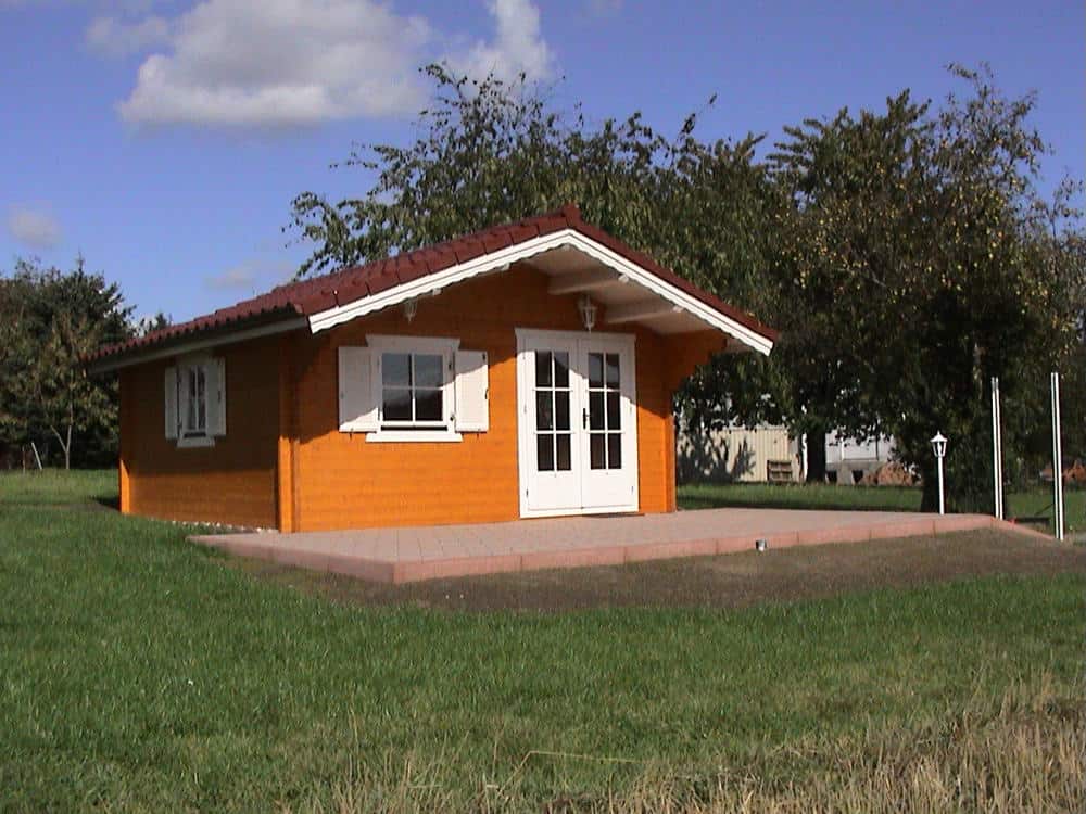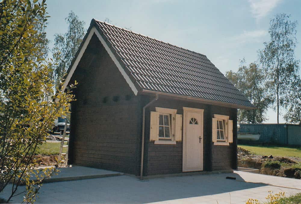 | Dach : | Sichtschalung von der Traufe bis zum First bestehend aus 19 mm dicken Nut- und Federbrettern. An den Giebelseiten ein doppeltes Schirmbrett, an der Traufe gefalzte Traufblenden. Die Dachkonstruktion ist statisch für eine Ziegeleindeckung ausgelegt. |