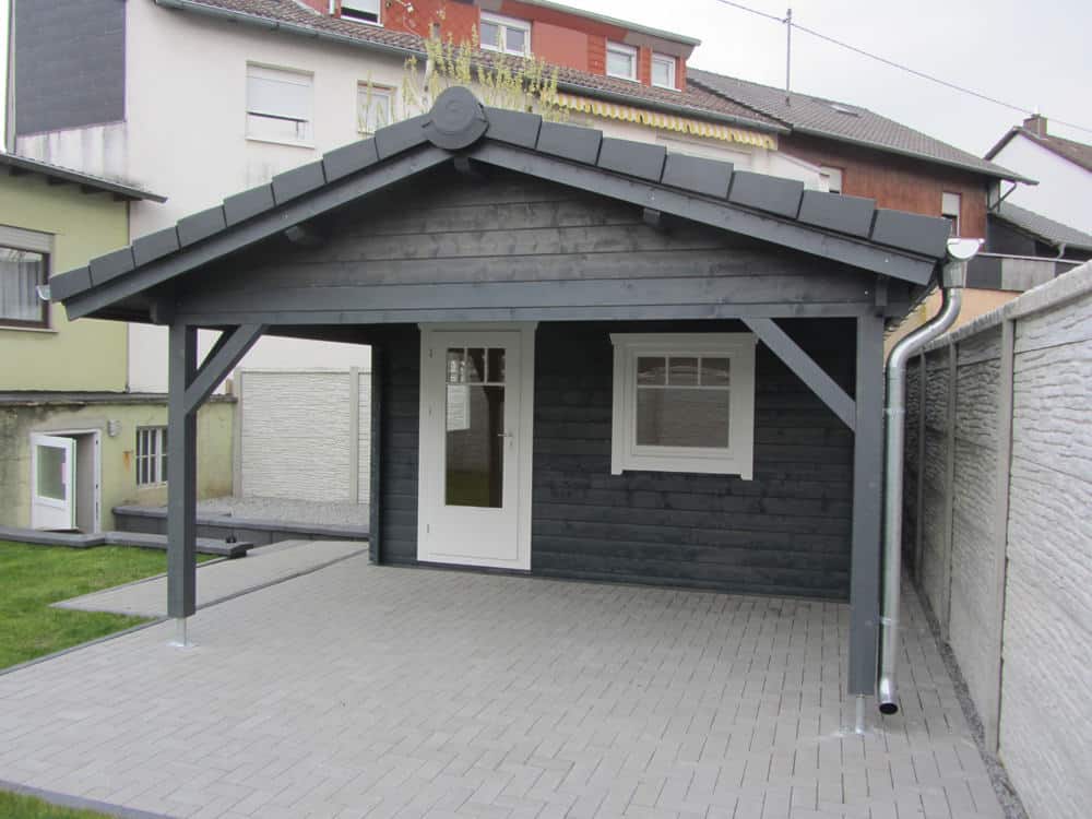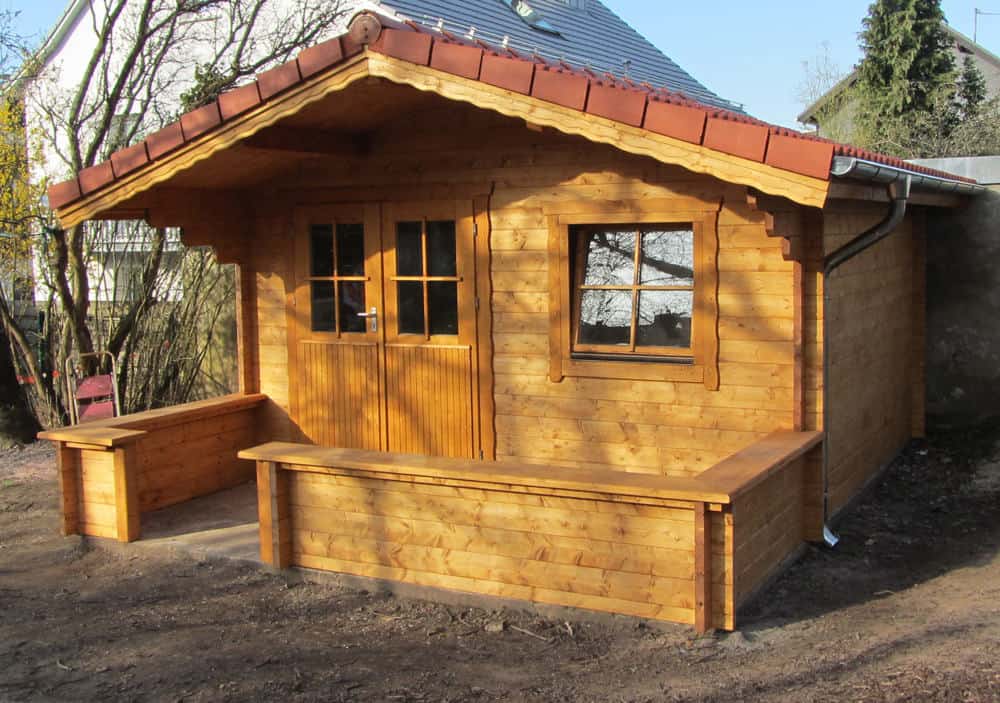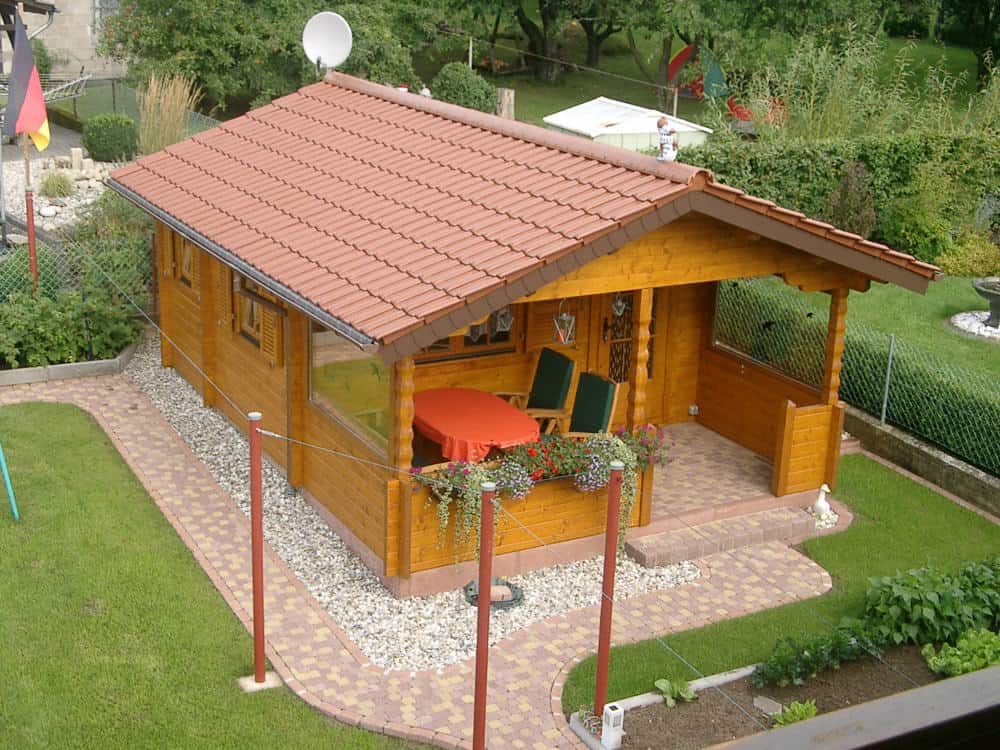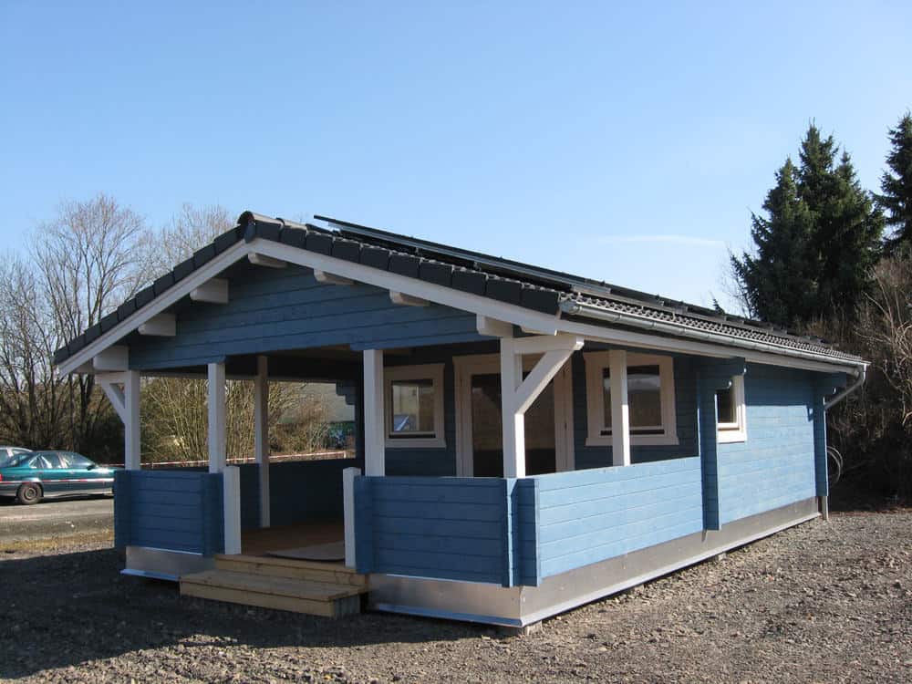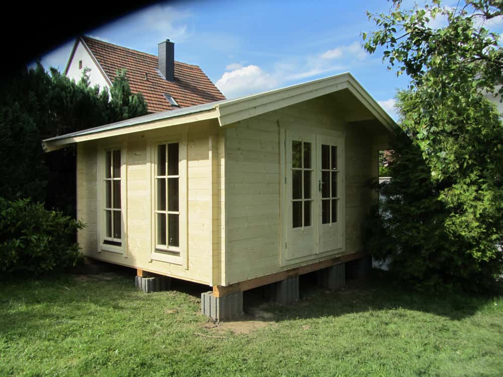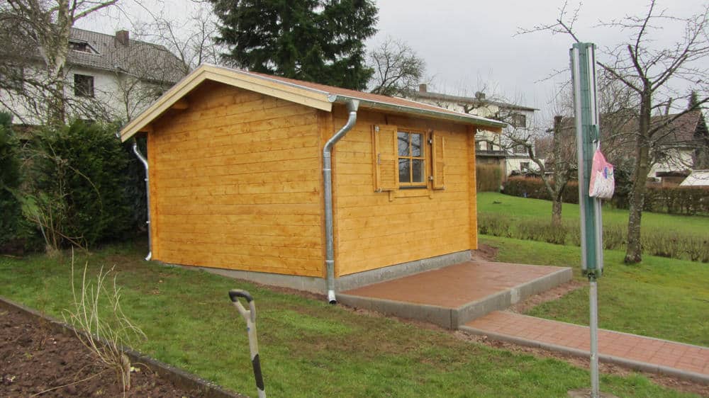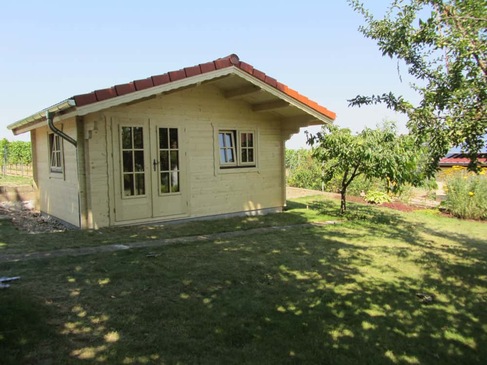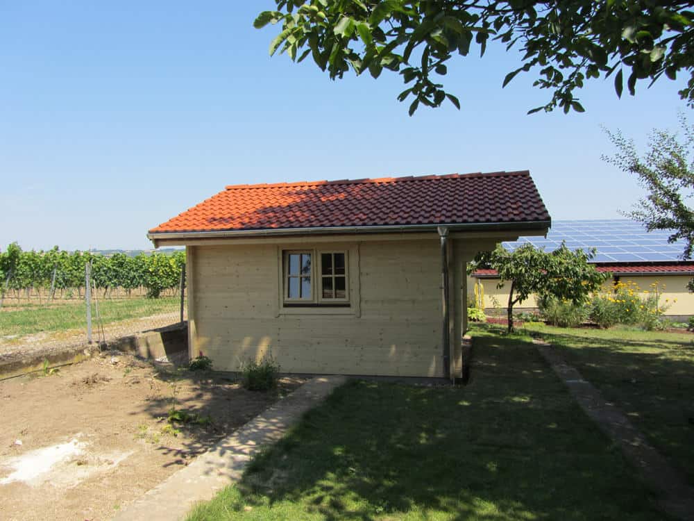 | Dach : | Sichtschalung von der Traufe bis zum First bestehend aus 19 mm dicken Nut- und Federbrettern. An den Giebelseiten ein doppeltes Schirmbrett, an der Traufe gefalzte Traufblenden. Die Dachkonstruktion ist statisch für eine Ziegeleindeckung ausgelegt. |