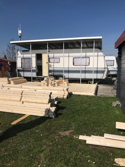 Teilweise wurde der Wohnwagen als Wetterschutz ebenfalls überdacht.
