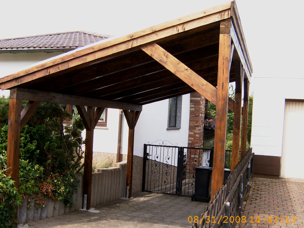 Sparrendach 8/16 cm auf 2 Unterzügen 12/16 cm. Gefaste Sichtschalung aus 19 mm dicken Nut- und Federbrettern und umlaufender Blende. Grundeindeckung V13 beschiefert. Befestigungsmaterial in verzinkter Ausführung (ohne Pfostenschuhe).