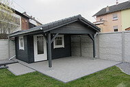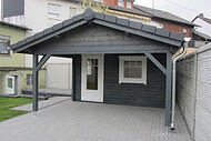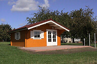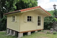 | Dach : | Sichtschalung von der Traufe bis zum First bestehend aus 19 mm dicken Nut- und Federbrettern. An den Giebelseiten ein doppeltes Schirmbrett, an der Traufe gefalzte Traufblenden. Die Dachkonstruktion ist statisch für eine Ziegeleindeckung ausgelegt. |