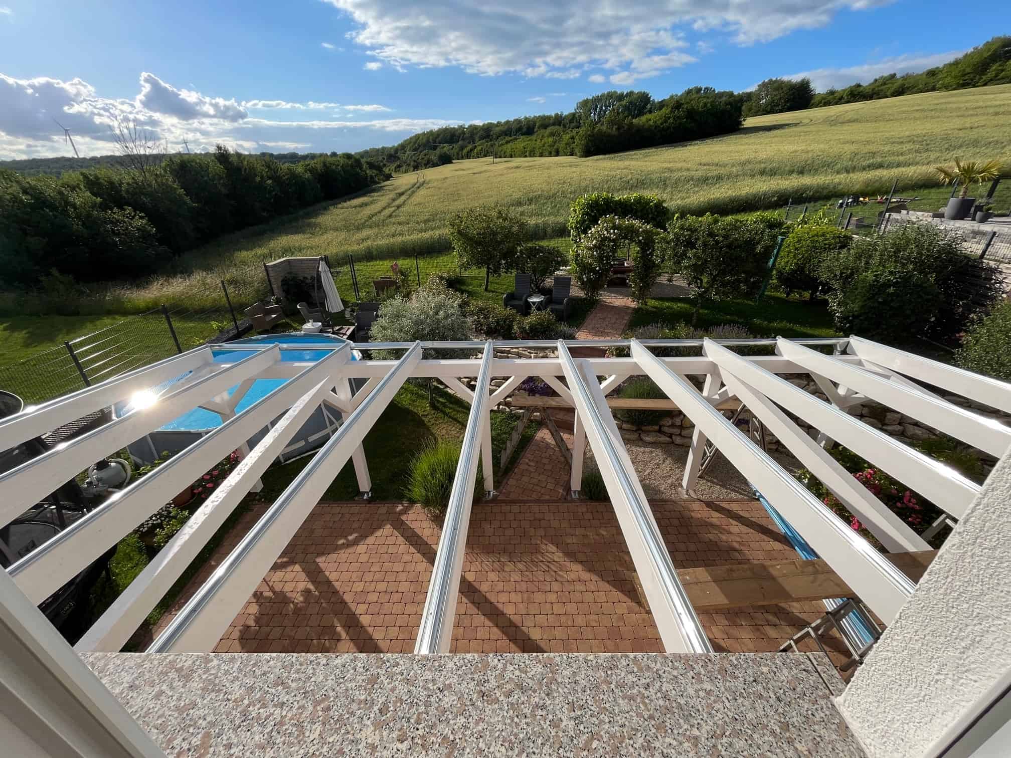 11 Pfosten 14/14 cm mit Kopfbändern, 10 Sparren 10/20 cm BSH allseitig gehobelt und gefast,
